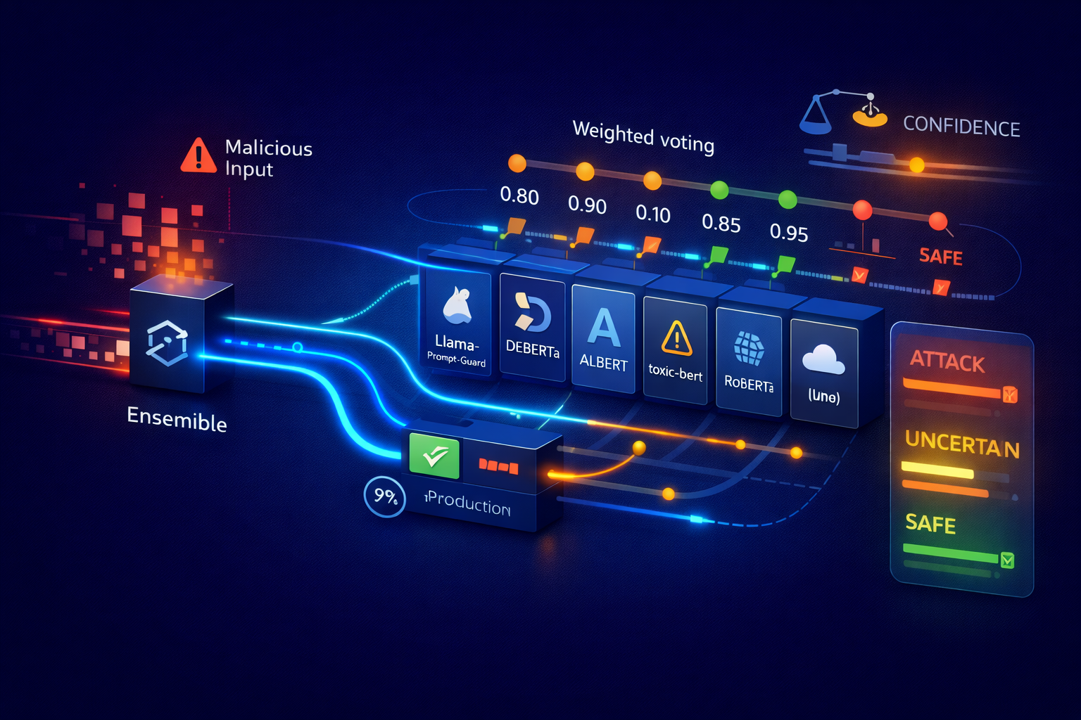 A technical deep dive into how PromptGuard's ensemble of Llama-Prompt-Guard, DeBERTa, ALBERT, toxic-bert, and RoBERTa classifies threats—covering parallel inference, weighted voting, category-specific thresholds, confidence calibration, and why five small models beat one large one.